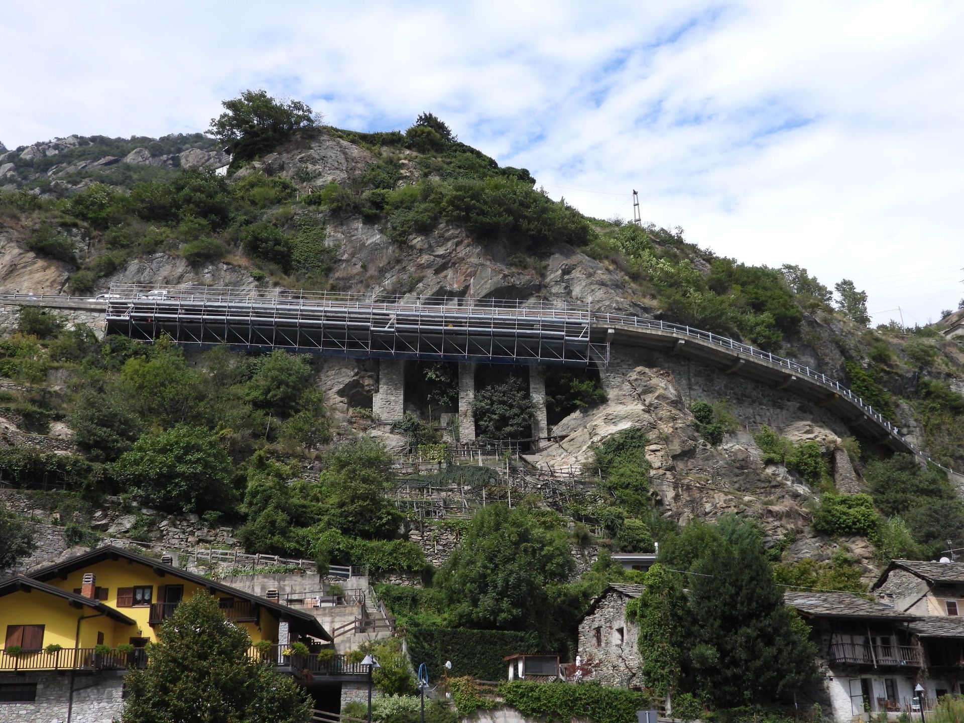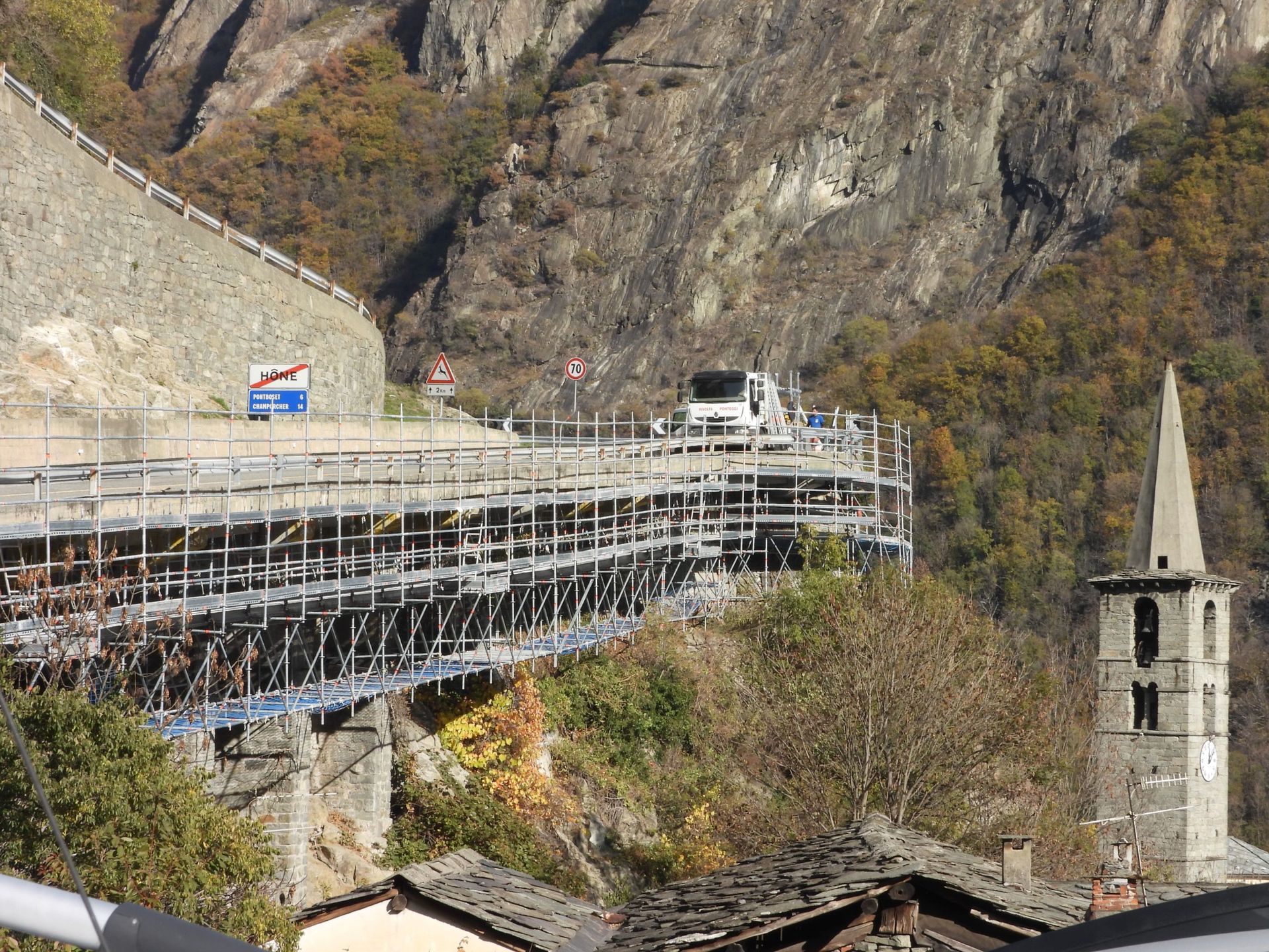 Rivolta Ponteggi ha realizzato la fornitura e il montaggio di una struttura provvisionale in multidirezionale Layher per gli interventi di manutenzione lungo la Strada Regionale 2 di Hone, in Valle d’Aosta.