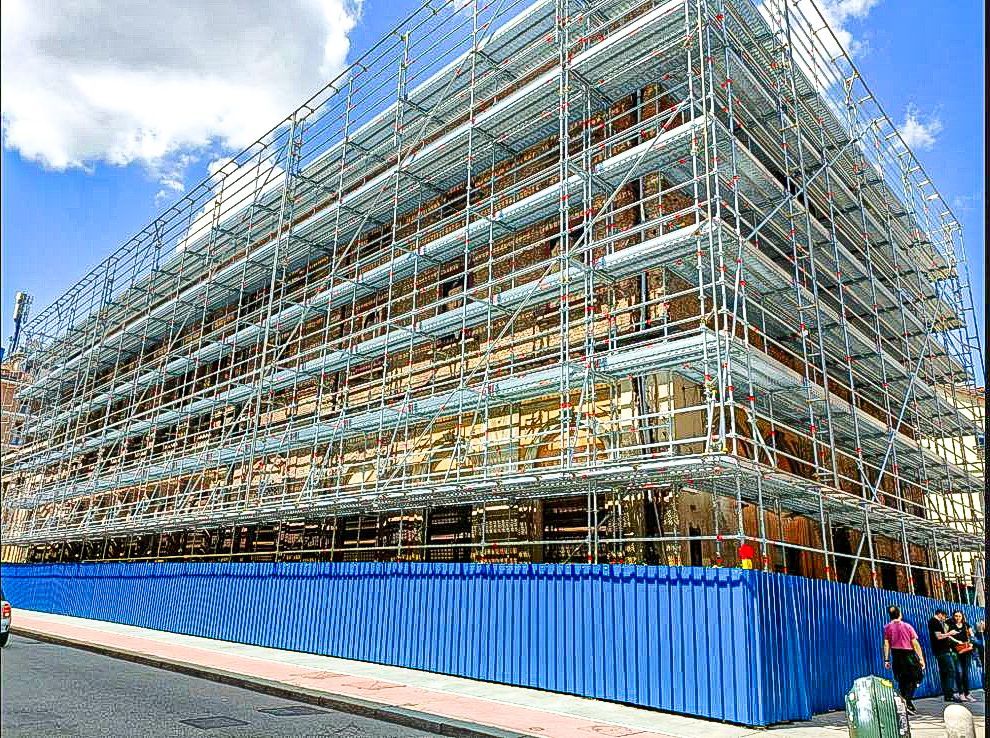 Sono stati utilizzati ponteggi multidirezionali Layher, progettati su misura per adattarsi alle geometrie articolate dell’edificio e garantire la massima sicurezza operativa.