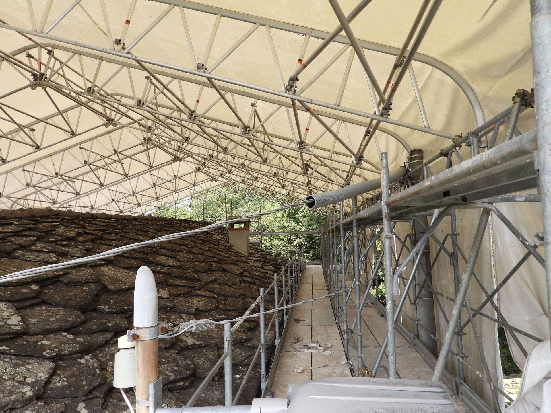 Questa soluzione, che è una tipologia di ponteggio sospeso, è stata progettata per consentire lavori complessi come la scarificazione del cemento armato, il controllo delle fondamenta e la sistemazione degli appoggi.