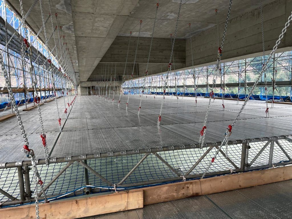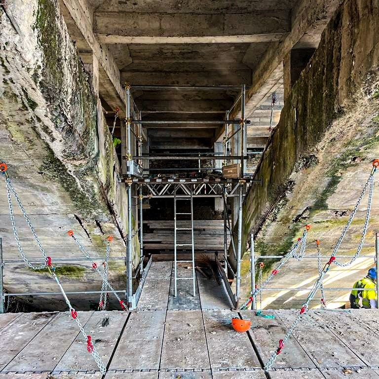 Cette solution, qui est un type d'échafaudage suspendu, a été conçue pour permettre des travaux complexes tels que la scarification du béton armé, la vérification des fondations et la disposition des supports.